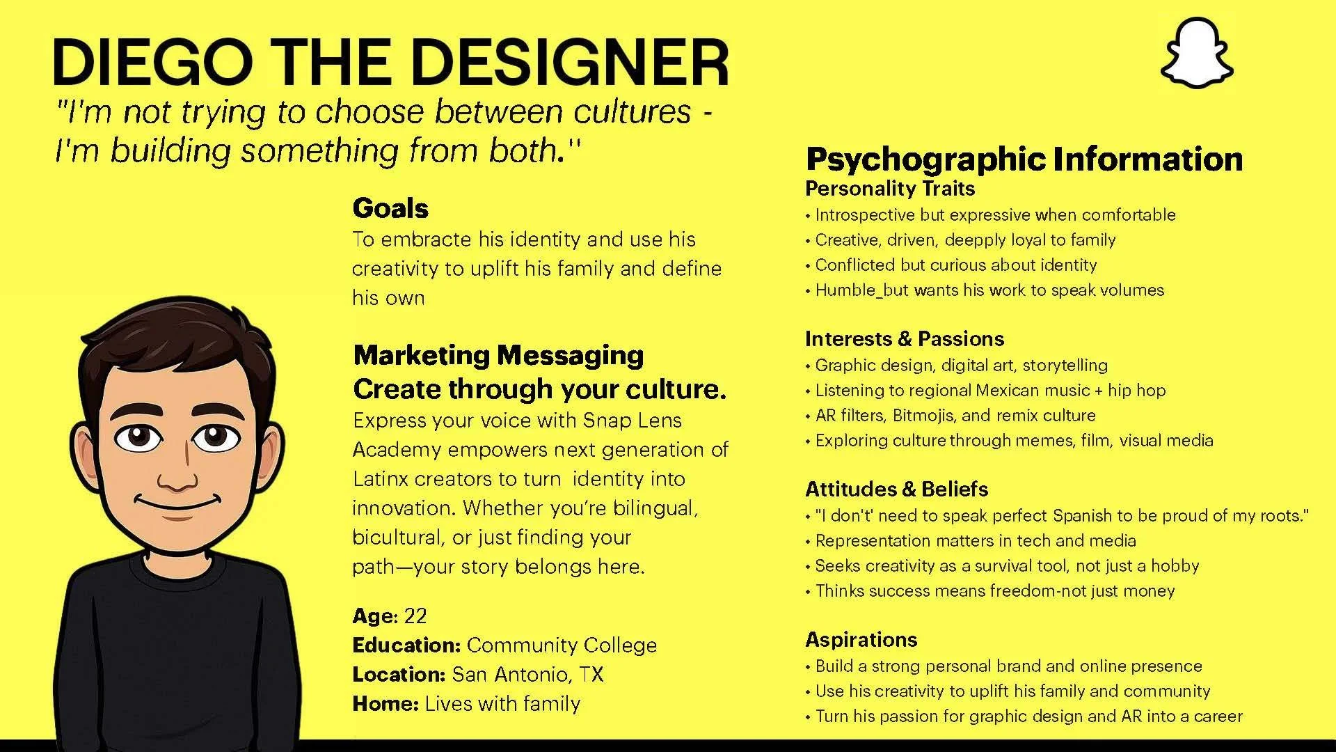 I developed Diego the Designer, a relatable AR creator persona, to humanize the Snap Lens Academy campaign for Gen Z audiences. This project combined persona-driven storytelling and full-funnel marketing strategy to inspire young Latinx creators to explore Snapchat’s AR tools.
